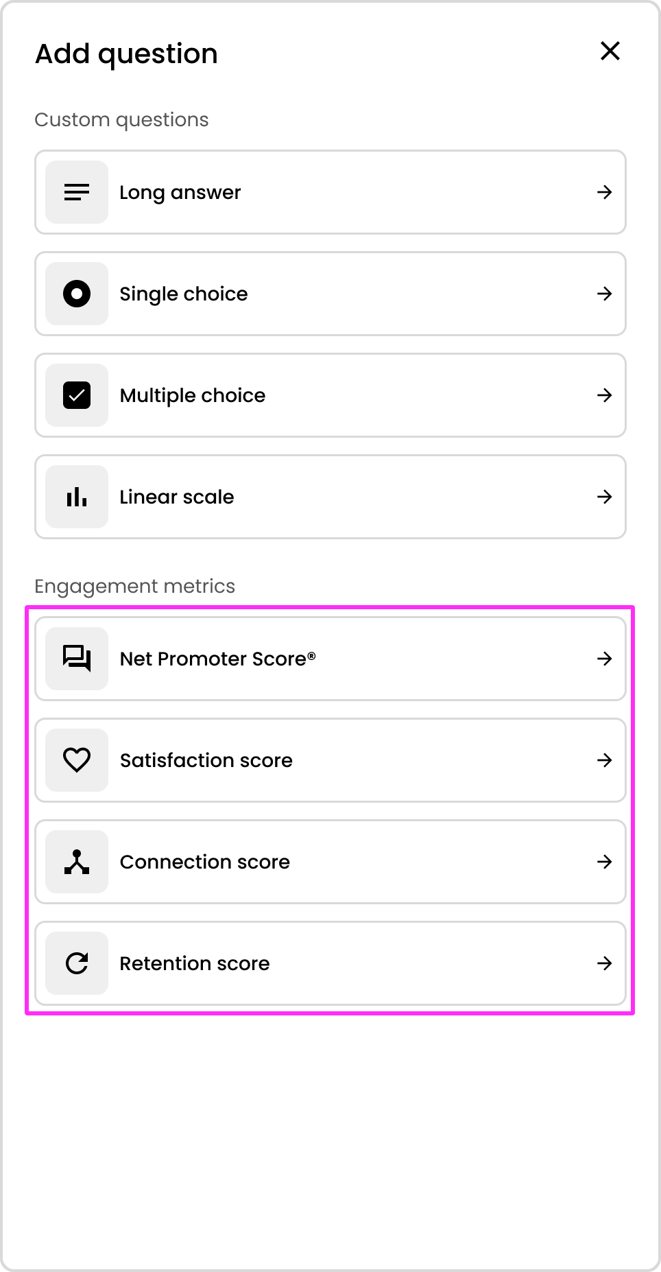 If you'd like to add more questions that are similar to an engagement metric question, you can create them using custom questions.